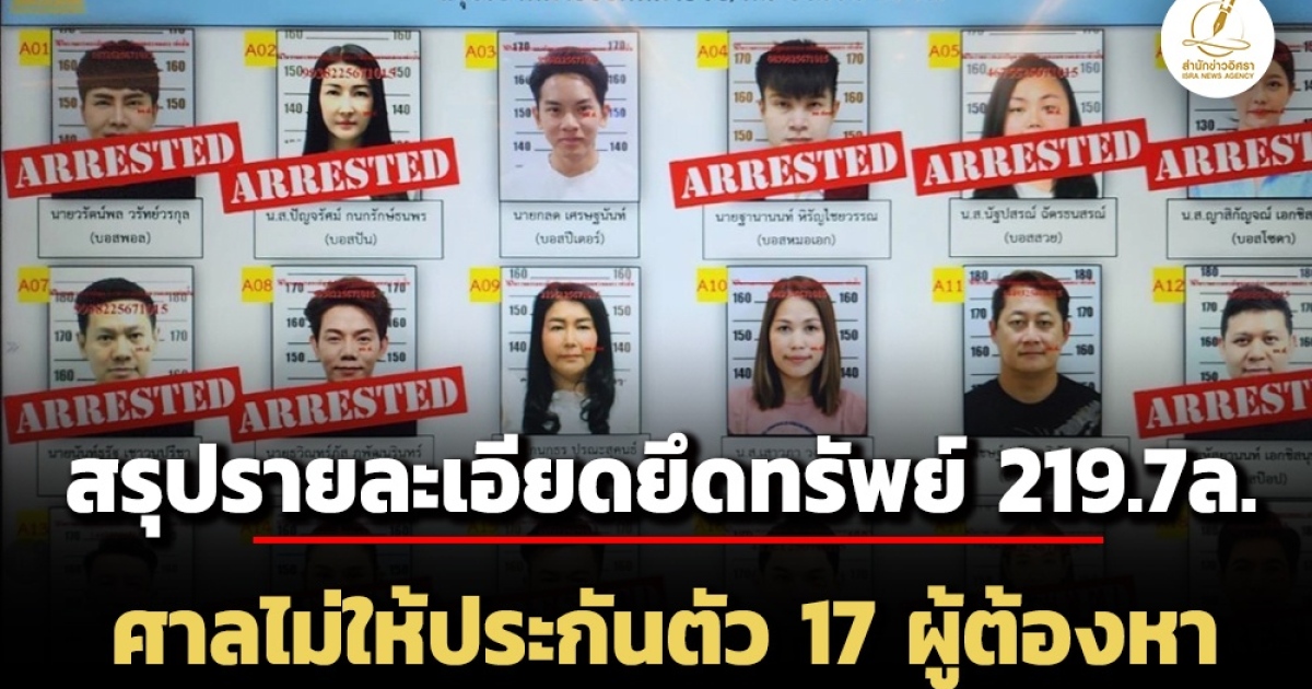 ตำรวจสรุปรายการยึดทรัพย์สินดิไอคอนกรุ๊ป รวมมูลค่าทรัพย์สิน ของมีค่า 219.7 ล้าน พบมีรถหรูร่วม 23 คัน เสื้อผ้าแบรนด์เนม 121 รายการ เผยข้อมูลทรัพย์สินบอสพอล ผู้บริหาร เยอะสุด 61ล้าน ขณะบอสกันมีทรัพย์สิน 17.7 ล้าน ด้านทนายบอสพอลแจงเจ้าตัวปฏิเสธข้อกล่าวหา ศาลยกคำร้อง ไม่ให้ประกันตัว 17 ผู้ตั้งหา หวั่นหลบหนี ยุ่งเหยิงกับพยานหลักฐาน