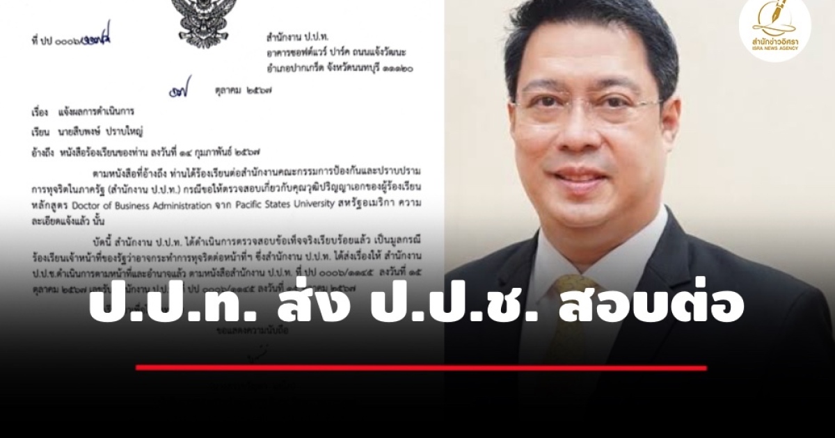 บัดนี้ สำนักงาน ป.ป.ท. ได้ดำเนินการตรวจสอบข้อเท็จจริงเรียบร้อยแล้ว เป็นมูลกรณีร้องเรียนเจ้าหน้าที่ของรัฐว่าอาจกระทำการทุจริตต่อหน้าที่ฯ ซึ่งสำนักงาน ป.ป.ท. ได้ส่งเรื่องให้ สำนักงาน คณะกรรมการป้องกันและปราบปรามการทุจริตแห่งชาติ(ป.ป.ช.)ดำเนินการตามหน้าที่และอำนาจแล้ว ตามหนังสือสำนักงาน ป.ป.ท. ที่ ปป 0006/1145 ลงวันที่ 15 ตุลาคม 2567 เลขรับ สำนักงาน ป.ป.ช. ที่ ปป 0006/1145 ลงวันที่ 15 ตุลาคม 2567