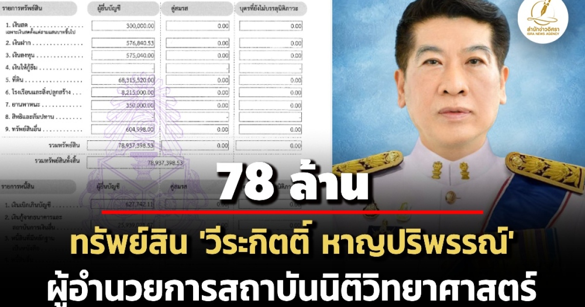 ป.ป.ช. เปิดทรัพย์สินผู้ดำรงตำแหน่งระดับสูง 'วีระกิตติ์ หาญปริพรรณ์' ผู้อำนวยการสถาบันนิติวิทยาศาสตร์ ทรัพย์สิน 78 ล. ที่ดิน 34 แปลง 68 ล. รายได้ 14 ล./ปี