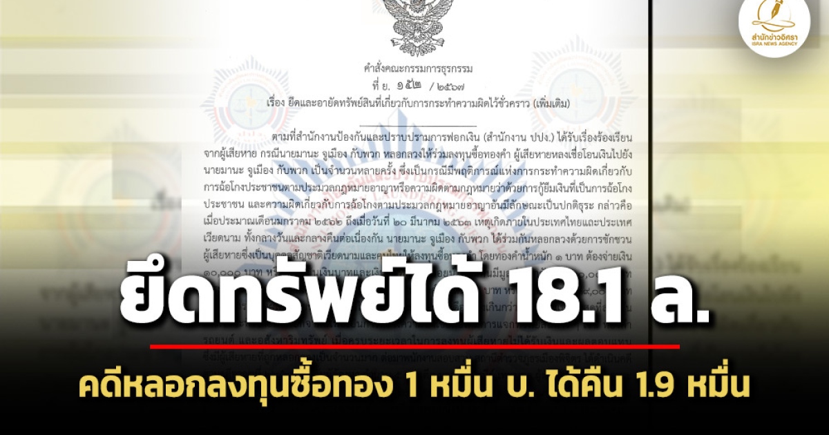 ยึดอายัดทรัพย์ได้ 18.1 ล้าน คดี ‘มานะ จูเมือง’ กับพวก ฉ้อโกง ฟอกเงิน หลอกลงทุนซื้อทองคำหนัก 1 บาท จ่าย 10,000 บาท ให้ผลตอบแทน 19,000 บาท ผู้เสียหายคนไทย-เวียตนาม 18 ราย 28.8 ล้าน แจ้งความ จ.พิจิตร สำนวนอาญาอยู่ในชั้นอัยการ