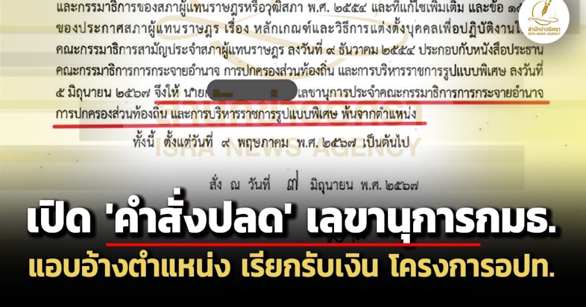 เปิดคำสั่งปลด เลขานุการประจำกมธ.กระจายอำนาจฯ สภาฯ แอบอ้างตำแหน่ง เรียกเงินเอกชน-ผู้ประกอบการ โครงการตรวจสุขภาพเด็กในอบต.ทั่วประเทศ-แข่งขันกีฬาเฉลิมพระเกียรติพระบาทสมเด็จพระเจ้าอยู่หัวฯ กมธ.ป.ป.ช.เผย ตรวจสอบพบ ประวัติฉ้อโกงโชกโชน