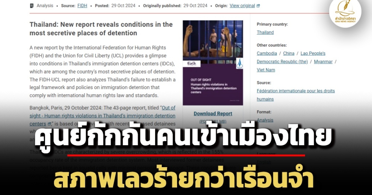 สำนักข่าวอิศรา (www.isranews.org) รายงานข่าวเกี่ยวกับสถานการณ์การละเมิดสิทธิมนุษยชนที่ถูกรายงานจากต่างประเทศว่า เมื่อวันที่ 29 ต.ค. สหพันธ์สิทธิมนุษยชนระหว่างประเทศ (FIDH) จากฝรั่งเศส และสมาคมสิทธิเสรีภาพของประชาชน (สสส.) ได้มีการออกรายงานฉบับใหม่ให้ข้อมูลเกี่ยวกับภาพรวมของภาพรวมของสภาพในศูนย์กักกันคนเข้าเมือง (IDC) ของประเทศไทย สังกัดสำนักงานตรวจคนเข้าเมือง สำนักงานตำรวจแห่งชาติ ซึ่ง IDC เป็นหนึ่งในสถานที่กักกันที่เป็นความลับที่สุดของประเทศ รายงานของ FIDH-UCL ยังวิเคราะห์ความล้มเหลวของประเทศไทยในการกําหนดกรอบกฎหมายและนโยบายเกี่ยวกับการกักตัวคนเข้าเมืองที่สอดคล้องกับกฎหมายและมาตรฐานสิทธิมนุษยชนระหว่างประเทศ