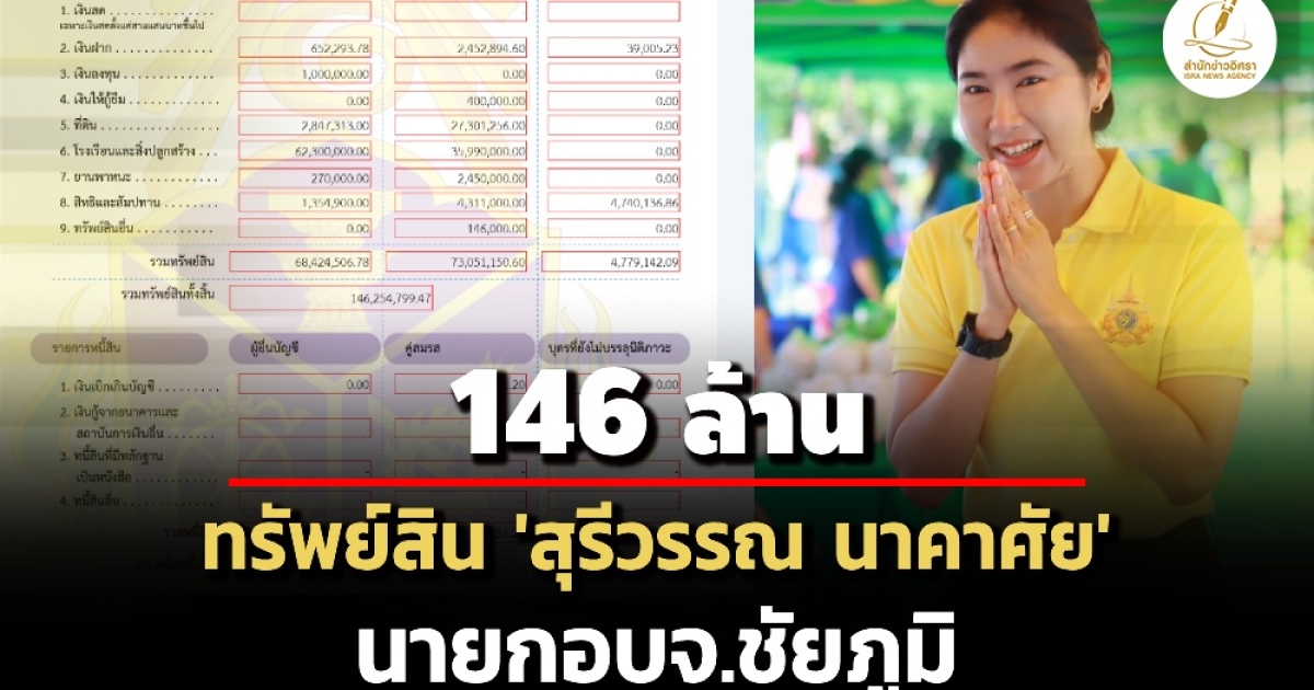 สำนักข่าวอิศรา (www.isranews.org) รายงานว่า เมื่อวันที่ 25 ต.ค. 2567 สำนักงานคณะกรรมการการป้องกันและปราบการทุจริตแห่งชาติ (ป.ป.ช.) เปิดเผยบัญชีแสดงรายการทรัพย์สินและหนี้สินของผู้บริหารองค์กรปกครองส่วนท้องถิ่น ราย นางสาวสุรีวรรณ นาคาศัย นายกองค์การบริหารส่วนจังหวัด (อบจ.) ชัยภูมิ กรณีเข้ารับตำแหน่ง เมื่อวันที่ 30 ส.ค. 2567