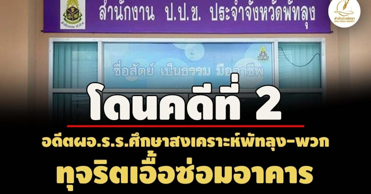 ไม่ใช่แค่คดีรถหลวง 'ปรัชวิญณ์ ไพโรจน์บวร' อดีต ผอ.โรงเรียนศึกษาสงเคราะห์พัทลุง ถูก ป.ป.ช.ชี้มูลความผิดคดีกล่าวหาทุจริตปรับปรุงซ่อมแซมบ้านพักอาคารเพิ่ม พร้อมพวกรวม 8 ราย พฤติการณ์เอื้อผู้รับเหมารับงาน ทำรัฐเสียหาย 130,723.85 บาท ส่งสำนวน อสส. ฟ้องร้องดำเนินคดีตามขั้นตอนกม.แล้ว-แจ้งให้ชดใช้ค่าเสียหายด้วย