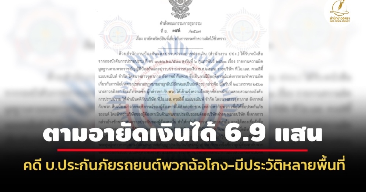 สำนักข่าวอิศรา (www.isranews.org) รายงานว่า สำนักงานป้องกันและปราบปรามการฟอกเงิน (สำนักงาน ปปง.) คำสั่งคณะกรรมการธุรกรรม ที่ย. 198 /2567 ลงวันที่ 18 กันยายน 2567 เรื่อง อายัดทรัพย์สินที่เกี่ยวกับการกระทำความผิดไว้ชั่วคราว รายบริษัท ที.ไอ.เอส. ควอลิตี้แมเนจเม้นท์ จำกัด โดยนางสาวจุฑาภาส อังกาพย์ กับพวก เป็นกรณีแห่งการกระทำความผิดเกี่ยวกับการฉ้อโกงตามประมวลกฎหมายอาญาอันมีลักษณะเป็นปกติธุระ ได้ติดต่อชักชวนผู้กล่าวหากับพวก เพื่อให้ซื้อประกันภัยรถยนต์ โดยอ้างว่าบริษัทของผู้ต้องหาเป็นตัวแทนขายประกันรถยนต์ของบริษัทต่างๆหลายบริษัท ทำให้กลุ่มผู้กล่าวหากับพวกสนใจ และได้หลงเชื่อสั่งซื้อประกันภัยรถยนต์ตามที่ผู้ต้องหาเสนอขายมาให้ พร้อมกับโอนเงินไปให้ผู้ต้องหากับพวก ต่อมาเมื่อถึงกำหนดส่งหนังสือสัญญาประกันภัยให้กับผู้กล่าวหากับพวกแล้ว ปรากฏว่าผู้ต้องหาไม่ส่งให้ตามที่ได้ตกลงกันไว้จริง พอกลุ่มผู้กล่าวหาทวงถามก็ผัดผ่อนการส่งสัญญาประกันภัยเรื่อยมาผู้กล่าวหากับพวกจึงเชื่อว่าถูกผู้ต้องหากับพวกหลอกลวงเอาเงินไป เป็นเหตุทำให้ได้รับความเสียหาย