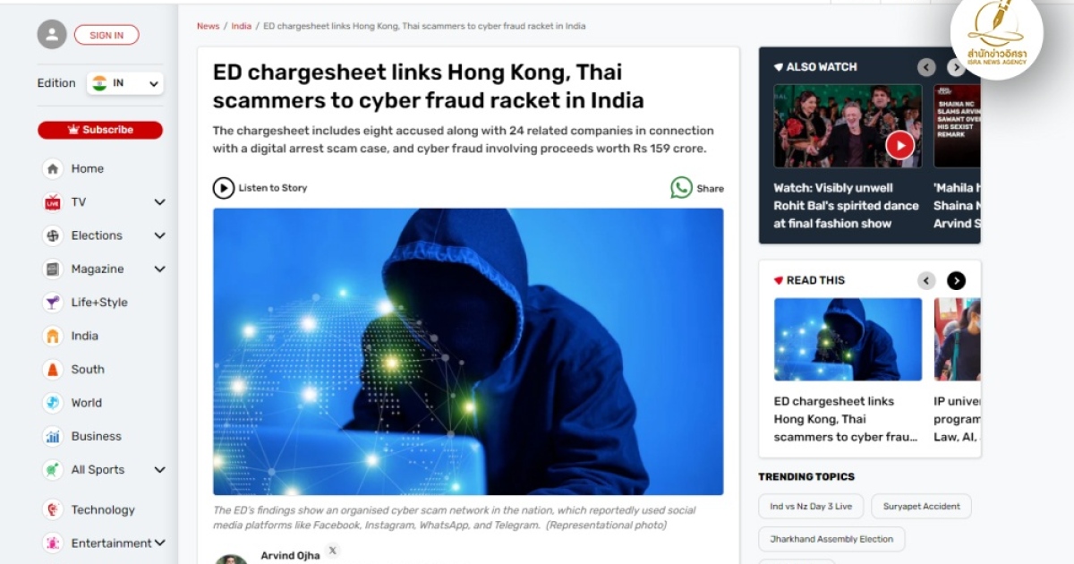 สำนักข่าวอิศรา (www.isranews.org) รายงานข่าวที่เกี่ยวกับคดีฉ้อโกงในต่างประเทศที่โยงมายังประเทศไทยว่า กองบังคับการปราบปราม สำนักงานบังคับใช้กฎหมาย (ED) ซึ่งเป็นหน่วยงานบังคับใช้กฎหมายและข่าวกรองด้านเศรษฐกิจของกระทรวงการคลังอินเดีย ได้เผยผลการตรวจสอบว่าพบข้อมูลว่านิติบุคคลในฮ่องกงและประเทศไทยเป็นผู้ที่วางแผนฉ้อโกงทางไซเบอร์ และการฟอกเงิน โดยได้รับความช่วยเหลือจากผู้ร่วมขบวนการในอินเดียที่เกี่ยวข้องกับอาชญากรทางไซเบอร์สร้างความเสียหาย 1.59 พันล้านรูปี (640,341,813 บาท)