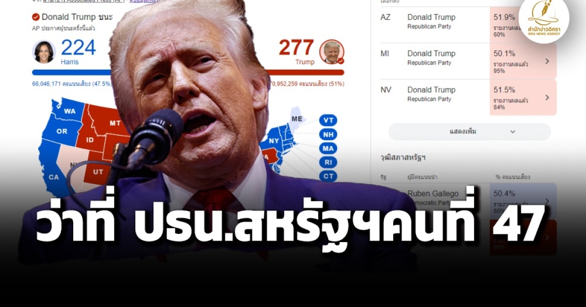 สำนักข่าวอิศรา (www.isranews.org) รายงานสถานการณ์เกี่ยวกับการเลือกตั้งประธานาธิบดีสหรัฐอเมริการะหว่างรองประธานาธิบดีกมลา แฮร์ริส กับอดีตประธานาธิบดีโดนัลด์ ทรัมป์ว่า ในช่วงเย็นตามเวลาที่ประเทศไทย นายทรัมป์ได้รับชัยชนะการเลือกตั้งประธานาธิบดีสหรัฐอเมริกา และได้เป็นว่าที่ประธานาธิบดีสหรัฐฯ คนที่ 47 ค่อนข้างที่จะแน่นอนแล้ว หลังได้รับคะแนนชนะนางแฮร์ริสที่รัฐวิสคอนซิน และเพนซิลวาเนีย หลังจากที่ก่อนหน้านี้นายทรัมป์ได้รับชัยชนะที่รัฐจอร์เจีย ส่งผลทำให้คะแนนล่าของนายทรัมป์นำนาแฮร์ริสอยู่ที่ 277 คะแนนต่อ 224 คะแนน