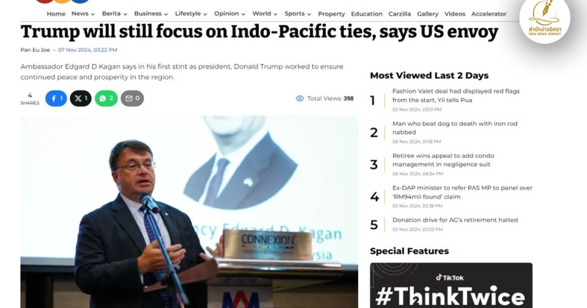 สำนักข่าวอิศรา (www.isranews.org) รายงานข่าวเกี่ยวกับการเข้ารับตำแหน่งเป็นประธานาธิบดีสหรัฐอเมริกาสมัยที่สองของนายโดนัลด์ ทรัมป์ กับผลกระทบต่อภูมิภาคอินโดแปซิฟิกว่านายเอ็ดการ์ด ดี คาแกน เอกอัครราชทูตสหรัฐฯ ประจํามาเลเซีย ได้กล่าวยืนยันว่าทีมบริหารของนายทรัมป์ที่เข้ามาดำรงตำแหน่งมุ่งเน้นไปที่ความสัมพันธ์ระหว่างวอชิงตันและอินโดแฟซิฟิก