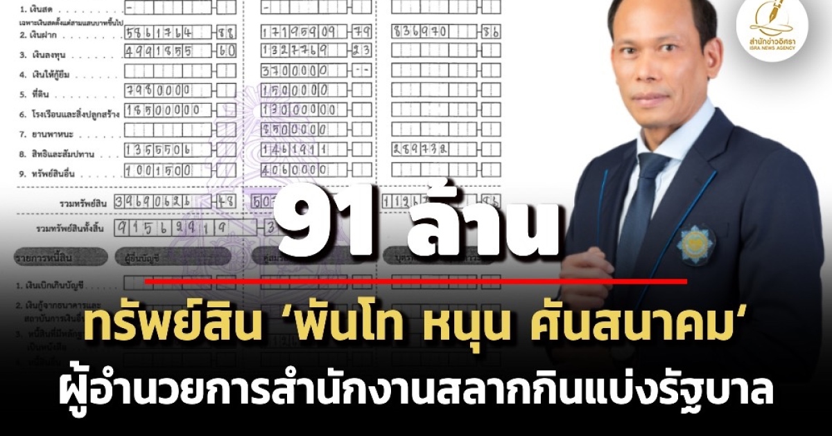 ป.ป.ช. เปิดทรัพย์สินผู้ดำรงตำแหน่งระดับสูง 'พันโท หนุน ศันสนาคม' ผอ.สำนักงานสลากกินแบ่งรัฐบาล ทรัพย์สิน 91 ล. รายได้ 7 ล./ปี