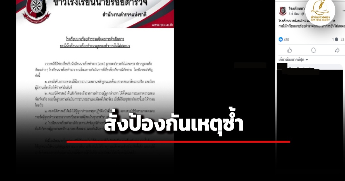 4.โรงเรียนนายร้อยตำรวจได้ประสานส่งข้อมูลให้กองบัญชาการตำรวจนครบาลซึ่งเป็นผู้บังคับบัญชาต้นสังกัดของผู้ถูกกล่าวหาอีก 1 รายเพื่อทราบและดำเนินการในส่วนที่เกี่ยวข้องต่อไป