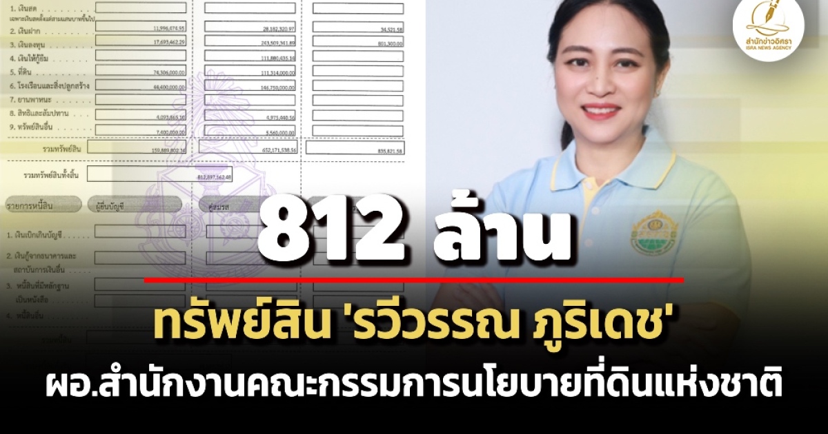 ป.ป.ช.เปิดทรัพย์สินผู้ดำรงตำแหน่งระดับสูง 'รวีวรรณ ภูริเดช' ผอ.สำนักงานคณะกรรมการนโยบายที่ดินแห่งชาติ ทรัพย์สิน 812 ล. รายได้ 2.5 ล./ปี