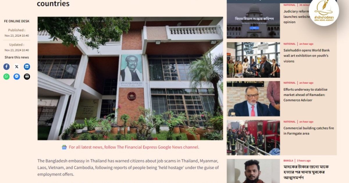 สำนักข่าวอิศรา (www.isranews.org) รายงานว่าเมื่อวันที่ 22 พ.ย.ที่ผ่านมา สถานทูตประเทศบังกลาเทศประจำประเทศไทยได้ออกคำเตือนพลเมืองเกี่ยวกับขบวนการฉ้อโกงจัดหางานในไทย, เมียนมา ลาว เวียดนาม และกัมพูชา ตามรายงานว่ามีผู้คนถูก 'จับเป็นตัวประกัน' หลังจากถูกหลอกให้รับฟ้องข้อเสนอการจ้างงาน