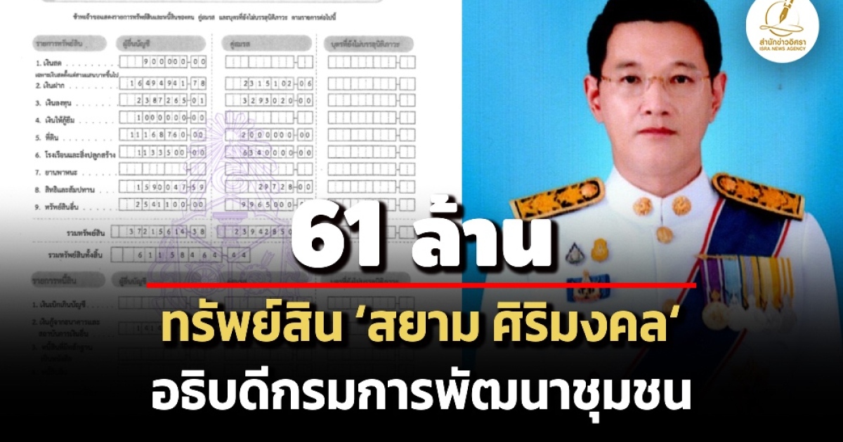 ป.ป.ช.เปิดทรัพย์สินผู้ดำรงตำแหน่งระดับสูง 'สยาม ศิริมงคล' อธิบดีกรมการพัฒนาชุมชน ทรัพย์สิน 61 ล. ที่ดิน 4 แปลง 11 ล. รายได้ 2.7 ล./ปี