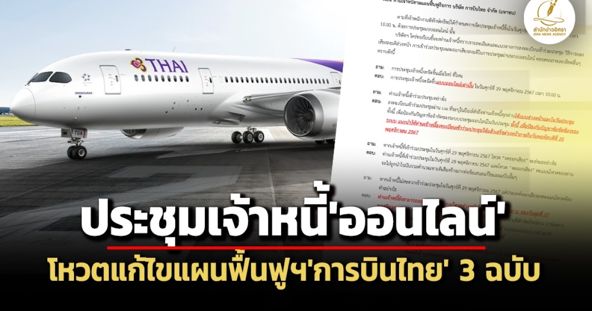 สำนักข่าวอิศรา (www.isranews.org) รายงานว่า เมื่อวันที่ 26 พ.ย.ที่ผ่านมา บริษัท การบินไทย จำกัด (มหาชน) ได้ส่งหนังสือแจ้งเจ้าหนี้ตามแผนฟื้นฟูกิจการ บริษัท การบินไทย จำกัด (มหาชน) เกี่ยวกับการจัดประชุมเจ้าหนี้ในวันที่ 29 พ.ย.2567 เวลา 10.00 น. เพื่อออกเสียงลงคะแนนโหวตข้อเสนอแก้ไขแผนฟื้นฟูกิจการ บริษัท การบินไทย จำกัด (มหาชน) จำนวน 3 ฉบับ โดยการประชุมเจ้าหนี้ดังกล่าว จะจัดขึ้นแบบออนไลน์เท่านั้น