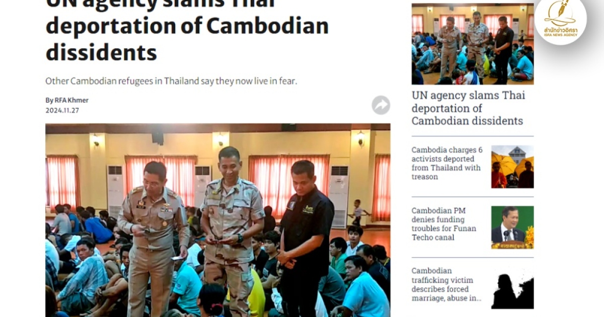 สำนักข่าวอิศรา (www.isranews.org) รายงานว่าเมื่อวันที่ 27 พ.ย.ที่ผ่านมา สำนักข่าวเรดิโอฟรีเอเชีย (RFA) ของสหรัฐอเมริกาได้รายงานข่าวกรณีที่ทางการไทยได้ผลักดันผู้เห็นต่างทางการเมืองชาวกัมพูชาจำนวนหกรายออกนอกประเทศ การกระทำเช่นนี้ทางสหประชาชาติหรือยูเอ็นได้ออกมาประณามว่าเป็นการกระทำที่ละเมิดความมุ่งมั่นต่อหลักการไม่ส่งกลับ ซึ่งห้ามไม่ให้รัฐดำเนินการส่งกลับผู้คนไปยังประเทศที่พวกเขาอาจเผชิญกับการทรมานหรือการละเมิดสิทธิมนุษยชนอื่น ๆ ตามการให้สัมภาษณ์ของโฆษก สํานักงานผู้ลี้ภัยแห่งสหประชาชาติที่ให้ไว้ต่อ RFA
