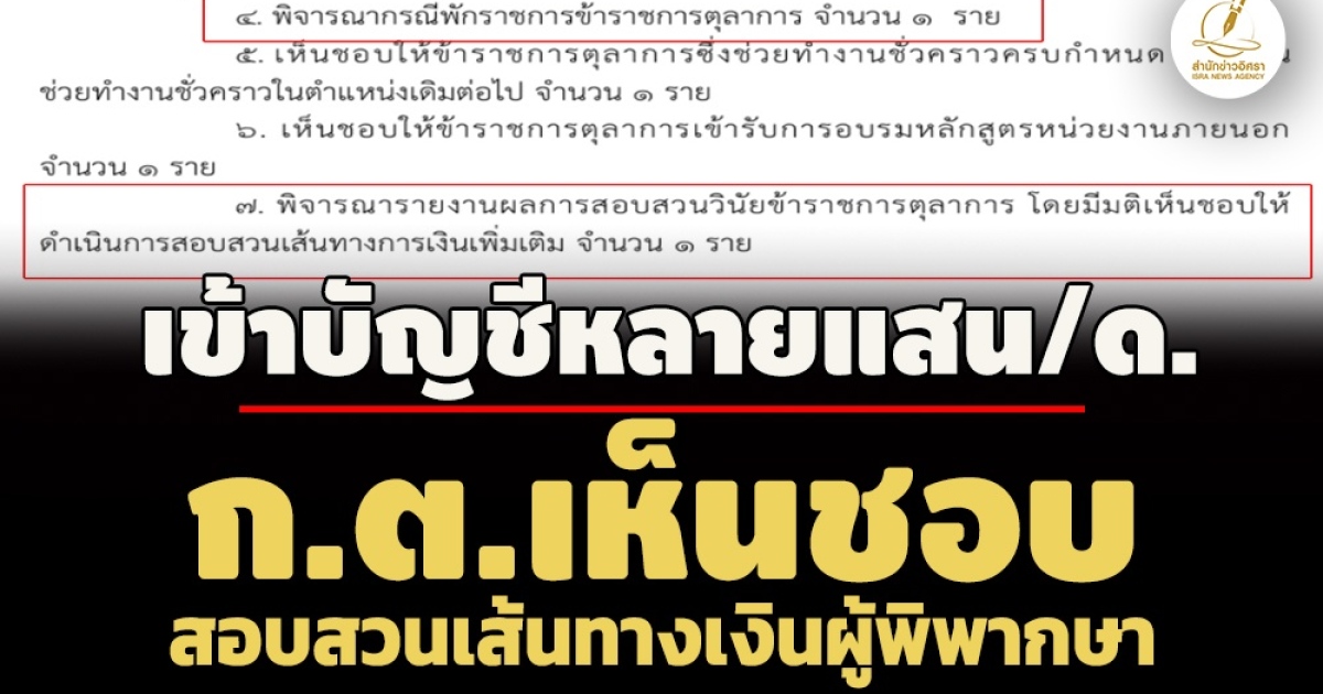 เผยข้อมูลลับผลประชุม ก.ต.พิจารณาลงโทษ 2 ผู้พิพากษา รายแรกไม่ยอมอยู่เวรวันหยุด ยังไม่เห็นชอบให้พักราชการ เหตุยังไม่มีรายละเอียดเบิกค่าเวรเข้าข่ายทุจริตด้วยหรือไม่ ส่วนคนสองเห็นชอบให้สอบสวนเส้นทางการเงินเพิ่ม คดีเกี่ยวเนื่องก่อสร้างศาลจังหวัดพระโขนง หลังพบมีเงินเข้าบัญชีในช่วงปี 60-63 มากผิดปกติเดือนละหลายแสนต่อเนื่องกัน รวมแล้วนับสิบล้านบาท