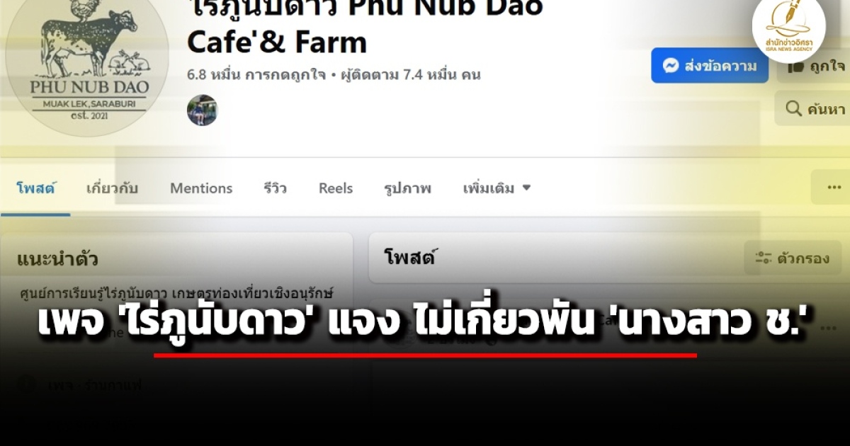 เพจเฟซบุ๊ก ‘ไร่ภูนับดาว Phu Nub Dao Café & Farm’ ได้โพสต์ข้อความชี้แจง ปม เข้าไปเกี่ยวข้องเส้นเงินพันล้าน กับ ‘นางสาว ช.’ คนใกล้ชิดนักการเมืองใหญ่’ โอด ได้รับผลกระทบ ‘ศูนย์การเรียนรู้เกษตรกรรม นวัตกรรมยั่งยืน ไร่ภูนับดาว’