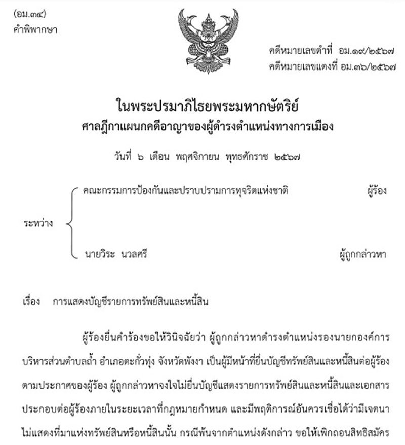 ศาลฎีกาแผนกคดีอาญาของผู้ดำรงตำแหน่งทางการเมือง วันที่ 6 พฤศจิกายน 2567 ระหว่าง คณะกรรมการป้องกันและปราบปรามการทุจริตแห่งชาติ ผู้ร้อง นายวีระ นวลศรี ผู้ถูกกล่าวหา เรื่อง การแสดงบัญชีรายการทรัพย์สินและหนี้สิน