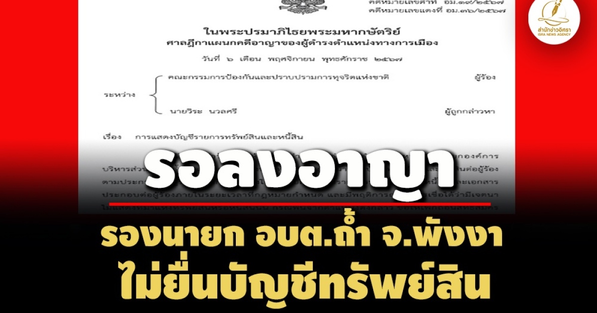 สำนักข่าวอิศรา www.isranews.org รายงานว่า เมื่อวันที่ 6 พฤศจิกายน 2567 ศาลฎีกาแผนกคดีอาญาของผู้ดำรงตำแหน่งทางการเมือง มีคำพิพากษาว่า นายวิระ นวลศรี รองนายกองค์การบริหารส่วนตำบลถ้ำ อำเภอตะกั่วทุ่ง จังหวัดพังงา ผู้ถูกกล่าวหา จงใจไม่ยื่นบัญชีแสดงรายการทรัพย์สินและหนี้สินและเอกสารประกอบต่อคณะกรรมการป้องกันและปราบปรามการทุจริตแห่งชาติ (คณะกรรมการ ป.ป.ช.) ผู้ร้องและมีพฤติการณ์อันควรเชื่อได้ว่ามีเจตนาไม่แสดงที่มาแห่งทรัพย์สินหรือหนี้สินกรณีพ้นจากตำแหน่งรองนายกองค์การบริหารส่วนตำบลถ้ำ ให้เพิกถอนสิทธิสมัครรับเลือกตั้งของผู้ถูกกล่าวหาตลอดไป จำคุก 2 เดือน และปรับ 8,000 บาท ผู้ถูกกล่าวหาให้การรับสารภาพเป็นประโยชน์แก่การพิจารณามีเหตุบรรเทาโทษ ลดโทษให้กึ่งหนึ่ง คงจำคุก 1 เดือน และปรับ 4,000 บาท ไม่ปรากฏว่าผู้ถูกกล่าวหาเคยได้รับโทษจำคุกมาก่อน โทษจำคุกจึงให้รอการลงโทษไว้มีกำหนด 1 ปี เรียบเรียงรายละเอียดดังนี้