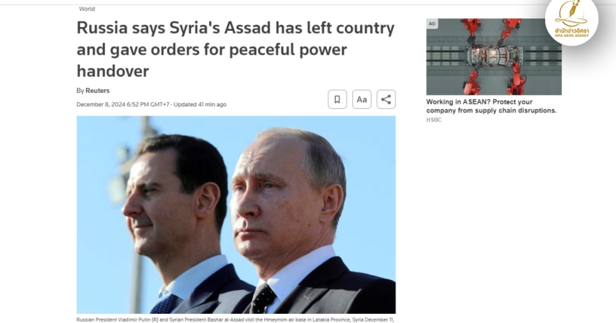 สำนักข่าวอิศรา (www.isranews.org) รายงานอ้างสำนักข่าวอัลจาซีราห์ระบุว่า กลุ่มติดอาวุธต่อต้านรัฐบาลซีเรียประกาศ “ยุคใหม่” ระบุ การล่มสลายของรัฐบาลของนายบาชาร์ อัล อัสซาดถือเป็นศักราชใหม่ในประวัติศาสตร์ซีเรีย หลังจากก่อนหน้านี้มีรายงานข่าวว่านายอัล อัสซาด หนีออกนอกประเทศไปแล้ว และกลุ่มกบฎสามารถเข้ายึดกรุงดามัสกัสได้
