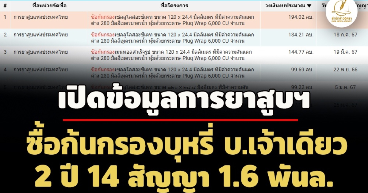 ไม่ใช่แค่ 2 โครงการใหญ่ 651 ล้าน! เปิดข้อมูลการยาสูบแห่งประเทศไทย จัดซื้อก้นกรองบุหรี่สำเร็จรูป บ.เทพวงศ์ อินเตอร์เทรดฯ เจ้าเดียว ปี 66-67 อีก 12 สัญญา 957.89 ล้าน เบ็ดเสร็จยอดรวม 14 สัญญา งบประมาณรวมกว่า 1,608.89 ล้าน