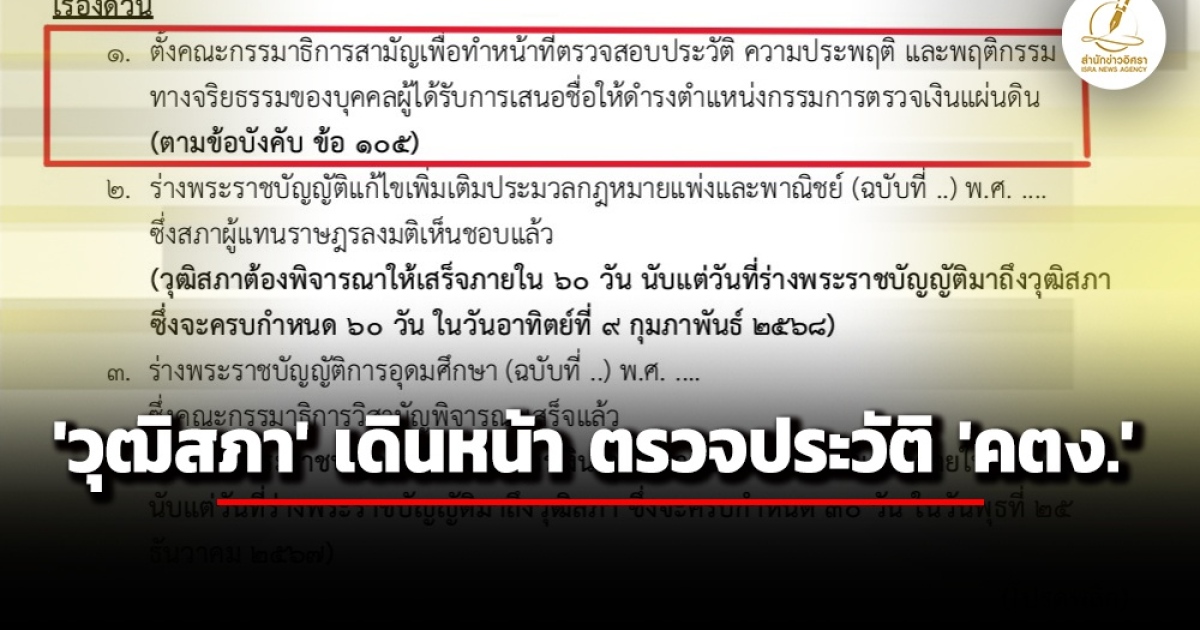 ‘ปัณณิตา สท้านไตรภพ’ เลขาธิการวุฒิสภา บรรจุระเบียบวาระ ‘เรื่องด่วน’ ตั้งคณะกรรมาธิการสามัญเพื่อทำหน้าที่ตรวจสอบประวัติ และพฤติกรรมทางจริยธรรมของบุคคลผู้ได้รับการเสนอชื่อให้ดำรงตำแหน่งกรรมการตรวจเงินแผ่นดิน แหล่งข่าวจาก สว. เผย กระบวนการได้หน้าได้ตามปกติ แม้ ศาลปกครองกลาง รับคำฟ้องการสรรหามิชอบ