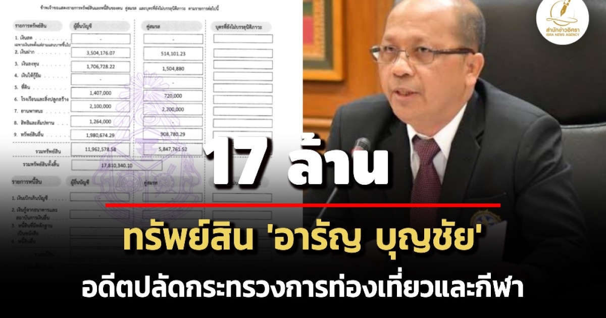 ป.ป.ช. เปิดทรัพย์สินผู้ดำรงตำแหน่งระดับสูง 'อารัญ บุญชัย' อดีตปลัดกระทรวงการท่องเที่ยวและกีฬา ทรัพย์สิน 17 ล. รายได้ 2 ล./ปี ไร้หนี้สิน