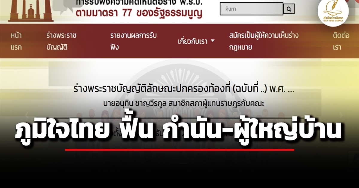 สำนักข่าวอิศรา (www.isranews.org) รายงานว่า เมื่อวันที่ 12 ธันวาคม 2567 เว็บไซต์รัฐสภาได้เปิดรับฟังความคิดเห็นต่อ ร่างพระราชบัญญัติ (พ.ร.บ.) ลักษณะการปกครองท้องที่ (ฉบับที่ ..) พ.ศ. .... และ ร่าง พ.ร.บ.เทศบาล (ฉบับที่ ..) พ.ศ. .... รวม 2 ฉบับ ตั้งแต่วันนี้ 12 ธ.ค.67 – 11 ม.ค.68 ซึ่งเป็นไปตามมาตรา 77 ของรัฐธรรมนูญ ที่เสนอโดยนายอนุทิน ชาญวีรกูล สมาชิกสภาผู้แทนราษฎร (สส.) แบบบัญชีรายชื่อ พรรคภูมิใจไทยกับคณะ