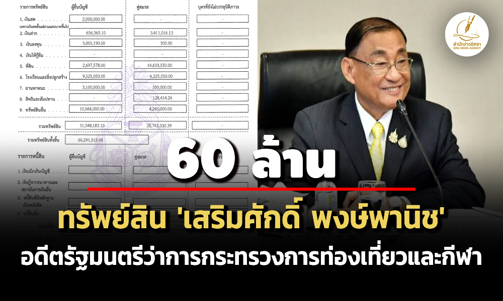 ป.ป.ช.เปิดทรัพย์สินรัฐมนตรี 'เสริมศักดิ์ พงษ์พานิช' อดีตรัฐมนตรีว่าการกระทรวงการท่องเที่ยวและกีฬา ทรัพย์สิน 60 ล. รายได้ 2.7 ล./ปี