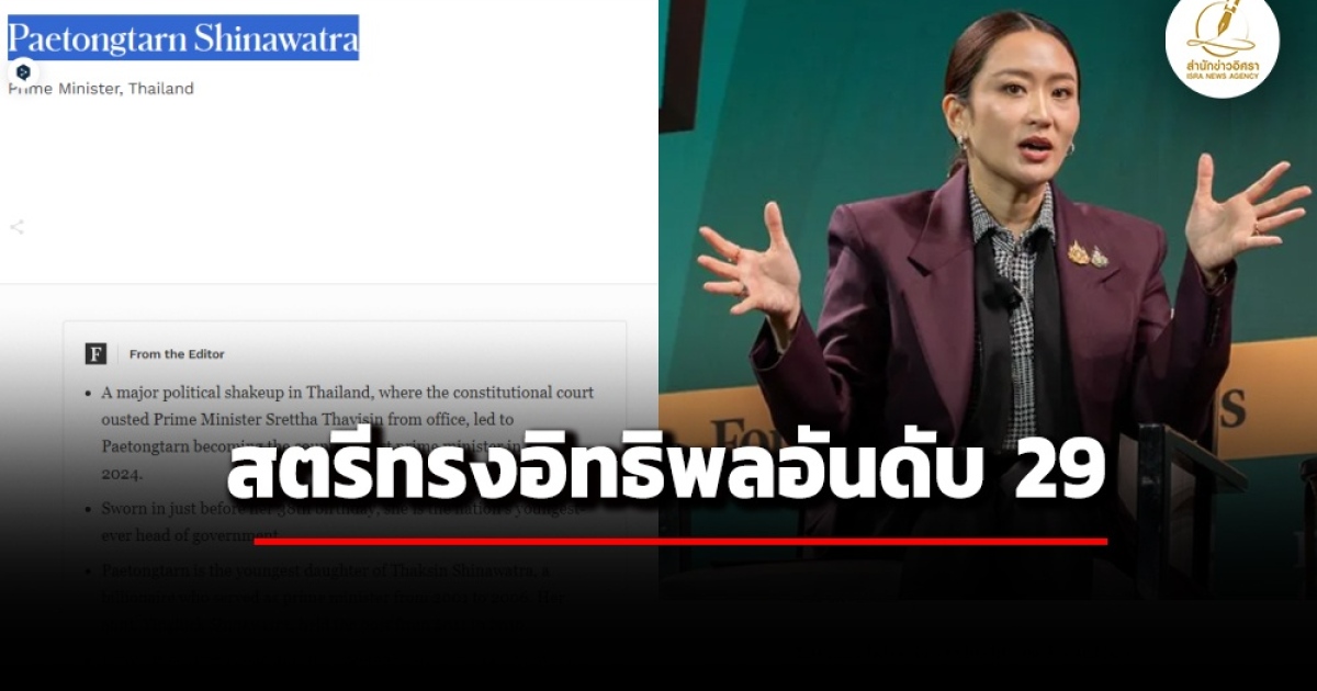 สำนักข่าวอิศรา (www.isranews.org) รายงานข่าวเกี่ยวกับกรณีที่นิตยสารฟอร์บส์ได้จัดอันดับ น.ส.แพทองธาร ชินวัตร นายกรัฐมนตรี ให้ติดอันดับที่ 29 จาก 100 สตรีผู้ทรงอิทธิพลประจำปี 2567 ว่าบรรณาธิการฟอร์บส์ได้กล่าวถึง น.ส.แพทองธารว่าในช่วงเดือน ส.ค.ที่ผ่านมา ศาลรัฐธรรมนูญได้มีคำพิพากษาให้นายเศรษฐา ทวีสิน พ้นจากตำแหน่งนายกรัฐมนตรี และเปิดประตูให้ น.ส.แพทองธารเป็นนายกรัฐมนตรีคนที่ 31 ถวายสัตย์เข้ารับตำแหน่งเพียงไม่กี่วันก่อนจะถึงวันเกิดปีที่ 38 ของ น.ส.แพทองธาร จึงทำให้เธอได้กลายเป็นหัวหน้ารัฐบาลที่อายุน้อยที่สุดและเป็นสตรีผู้ทรงอิทธิผลอันดับที่ 29
