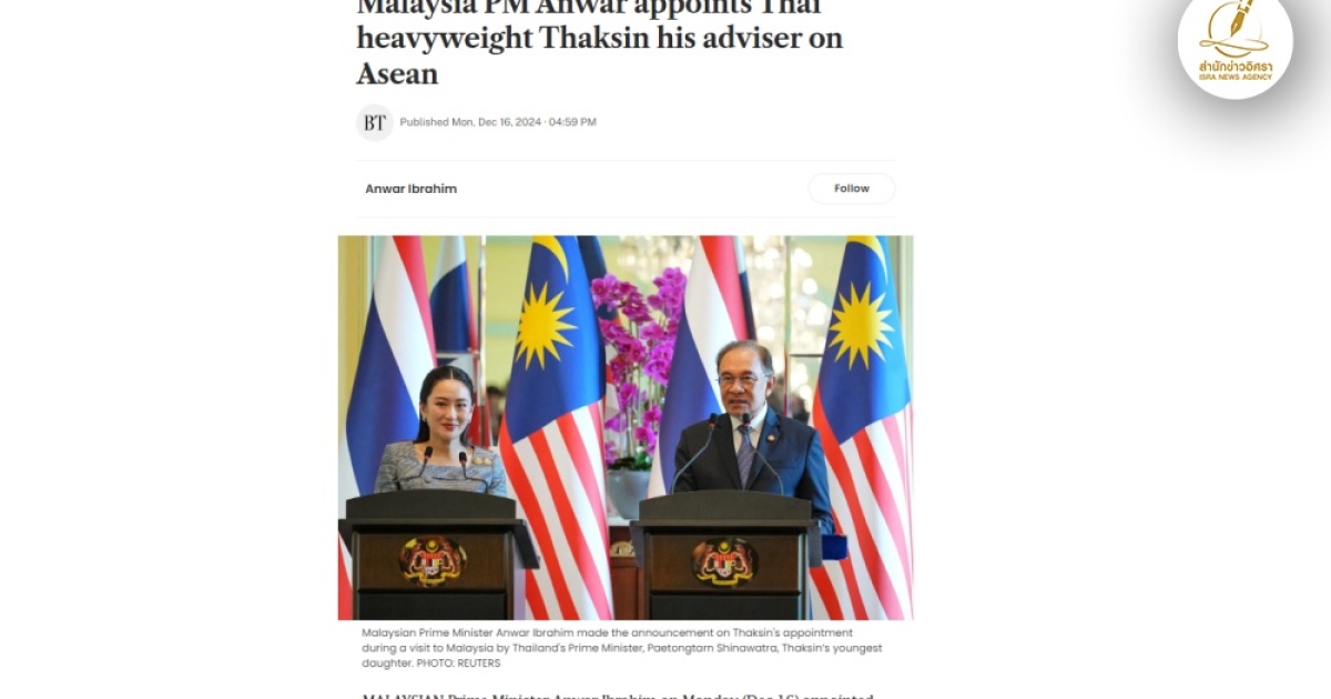สำนักข่าวอิศรา (www.isranews.org) รายงานข่าวต่างประเทศที่เชื่อมโยงกับประเทศไทยว่านายอันวาร์ อิบราฮิม นายกรัฐมนตรีมาเลเซีย ได้มีการแต่งตั้งนายทักษิณ ชินวัตร มหาเศรษฐี และอดีตนายกรัฐมนตรีไทยเป็นที่ปรึกษาส่วนตัวของนายอันวาร์ เมื่อนายอันวาร์ขึ้นดำรงตำแหน่งเป็นประธานกลุ่มภูมิภาคเอเชียตะวันออกเฉียงใต้หรืออาเซียนในปี 2568