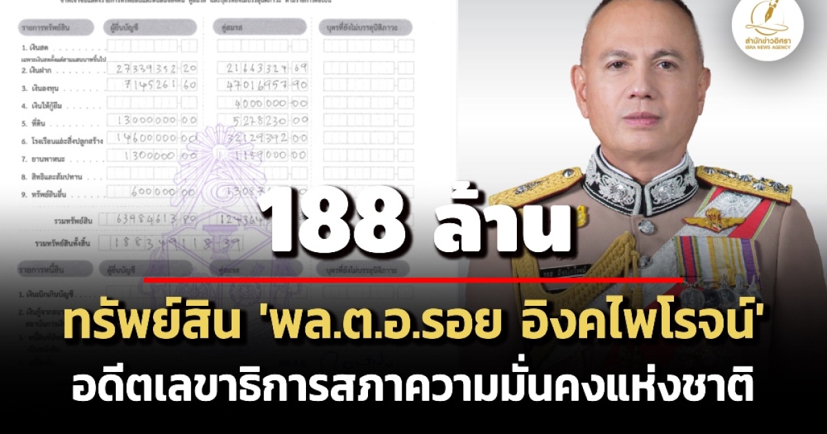 ป.ป.ช. เปิดทรัพย์สินผู้ดำรงตำแหน่งระดับสูง 'พล.ต.อ.รอย อิงคไพโรจน์' อดีตเลขาธิการสภาความมั่นคงแห่งชาติ ทรัพย์สิน 188 ล. เงินฝาก 27 ล. สะสมปืน 15 กระบอก รายได้ 2 ล./ปี ไร้หนี้สิน