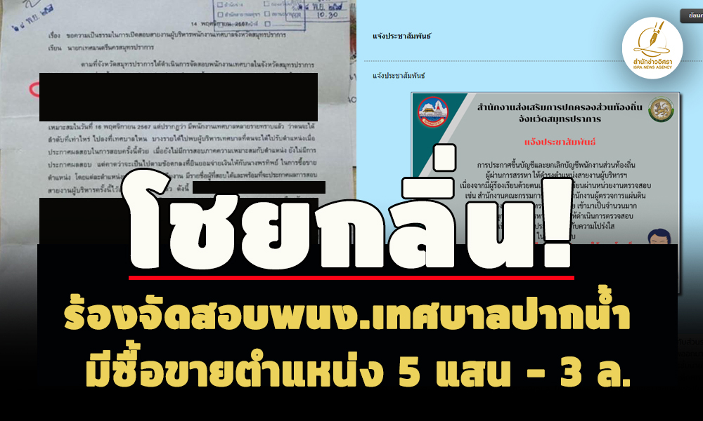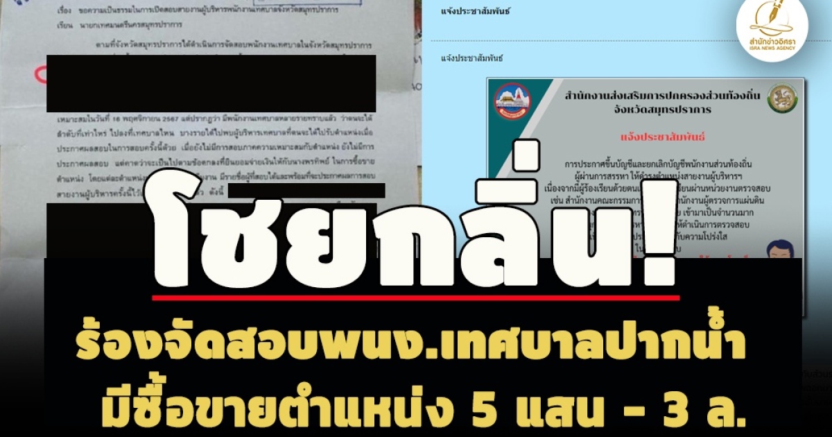 จัดสอบพนง.เทศบาลนครสมุทรปราการ โชยกลิ่น! มีร้องเรียนอ้างอัตราซื้อขายตำแหน่งสูง เฉลี่ย 5 แสน - 3 ล้าน แฉคนใกล้ชิดขรก.ระดับสูง คอยจัดสรรเรียกรับเงินตำแหน่งต่างๆ ราคาแตกต่างกัน ด้าน 'สรวิศ เต่าทอง' รองนายกเทศฯ ปากน้ำ แจง 'อิศรา' เห็นเรื่องแล้ว ขอตรวจสอบฝ่ายนิติกรก่อน เหตุมีผู้ร้องไปหลายหน่วยงาน ป.ป.ช.-สตง.เข้าตรวจอยู่ ล่าสุดสำนักท้องถิ่นฯ แพร่ประกาศคณะอนุสรรหาฯ สั่งตรวจสอบเป็นทางการเรื่องความโปร่งใสแล้ว