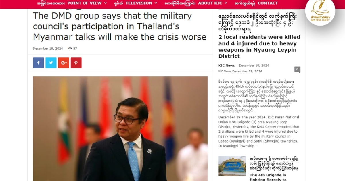 สำนักข่าวอิศรา (www.isranew.org) รายงานความเคลื่อนไหวเกี่ยวกับการประชุมเกี่ยวกับประเทศเมียนมาที่ประเทศไทยซึ่งจัดขึ้นระหว่างวันที่ 19-20 ธ.ค. นี้ว่า กลุ่มปกป้องประชาธิปไตยเมียนมาชื่อว่า The Defend Myanmar Democracyหรือกลุ่ม DMD ได้ออกมาวิจารณ์การเข้ามีส่วนร่วมของตัวแทนสภาทหารในการหารือไม่เป็นทางการที่ประเทศไทยว่าจะทำให้สถานการณ์การเมืองของเมียนมาเลวร้ายลงไปอีก