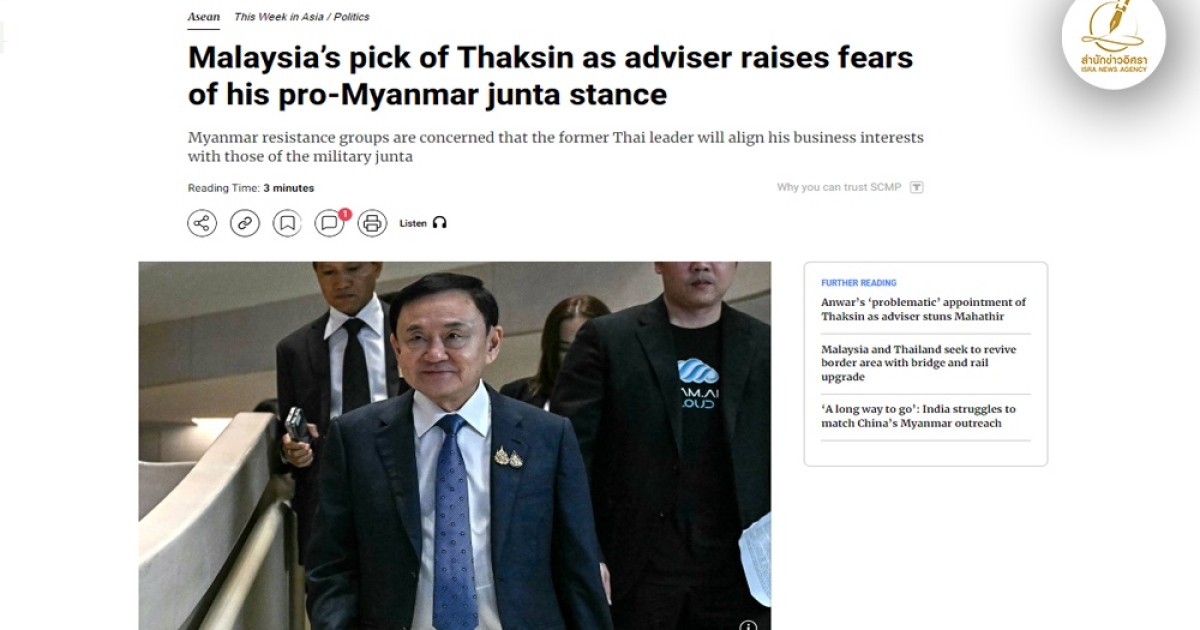 สำนักข่าวอิศรา (www.isranews.org) รายงานข่าวเกี่ยวกับความเคลื่อนไหวกรณีนายอันวาร์ อิบราฮิม นายกรัฐมนตรีมาเลเซีย ได้แต่งตั้งนายทักษิณ ชินวัตร อดีตนายกรัฐมนตรีไทยเป็นที่ปรึกษาประธานอาเซียน มีผลตั้งแต่ปี 2568 โดยเซาธ์ไชน่ามอร์นิ่งโพสต์รายงานว่าการแต่งตั้งดังกล่าวนั้นทำให้เกิดเสียงวิจารณ์อย่างรุนแรงจากกลุ่มต่อต้านรัฐบาลทหารในเมียนมา ซึ่งกลัวว่าการมีส่วนร่วมของนายทักษิณอาจทําให้แนวทางของมาเลเซียต่อวิกฤตเมียนมาสอดคล้องกับผลประโยชน์ของรัฐบาลทหาร