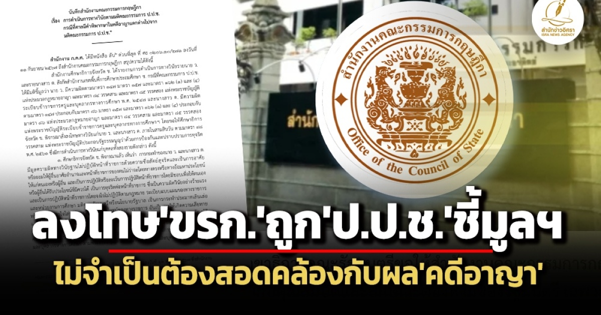 สำนักข่าวอิศรา (www.isranews.org) รายงานว่า เมื่อเร็วๆนี้ สำนักงานคณะกรรมการกฤษฎีกา ได้เผยแพร่บันทึกสำนักงานฯ เรื่อง การดำเนินการทางวินัยตามมติคณะกรรมการป้องกันและปราบปรามการทุจริตแห่งชาติ (ป.ป.ช.) กรณีที่ศาลมีคำพิพากษาในคดีอาญาแตกต่างไปจาก มติคณะกรรมการ ป.ป.ช. (เรื่องเสร็จที่ 1342/2567) หลังจากสำนักงานคณะกรรมการข้าราชการครูและบุคลากรทางการศึกษา (ก.ค.ศ.) มีส่งหนังสือหารือในเรื่องดังกล่าว
