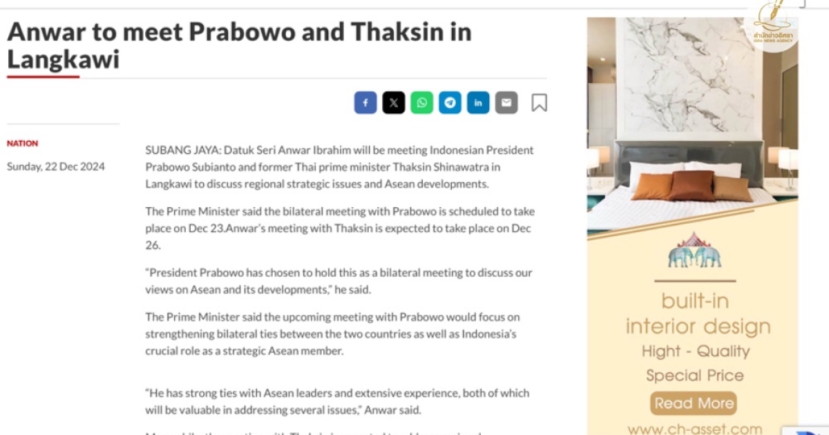 สำนักข่าวอิศรา (www.isranews.org) รายงานว่า เมื่อวันที่ 22 ธ.ค. 2567 เว็บไซต์เดอะสตาร์ มาเลเซีย รายงานว่า นายอันวาร์ อิบราฮิม นายกรัฐมนตรีมาเลเซีย จะพบกับ นายปราโบโว สุเบียนโต ประธานาธิบดีอินโดนีเซีย และนายทักษิณ ชินวัตร อดีตนายกรัฐมนตรีไทย ในเกาะลังกาวี เพื่อหารือเกี่ยวกับประเด็นยุทธศาสตร์ในภูมิภาคและการพัฒนาอาเซียน