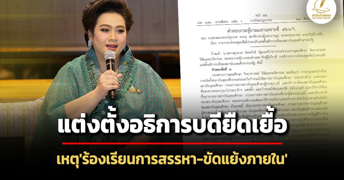 เผยข้อมูล 'ศุภมาส อิศรภักดี' รมว.อว. ตอบกระทู้ปมเสนอแต่งตั้งอธิการบดียืดเยื้อหลายสถาบัน เปิด 3 สาเหตุหลัก 'ร้องเรียนการสรรหา-อยู่ระหว่างฟ้องร้อง-ขัดแย้งภายใน' พร้อมวาง 4 แนวทางแก้ไข