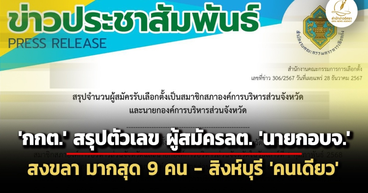 คณะกรรมการการเลือกตั้ง สรุปจำนวนผู้สมัครรับเลือกตั้งนายกองค์การบริหารส่วนจังหวัด จำนวน 192 คน - สมาชิกสภาองค์การบริหารส่วนจังหวัด จำนวน 6,815 คน สงขลา ผู้สมัคร นายก อบจ.มากสุด 9 คน - สิงห์บุรี คนเดียว