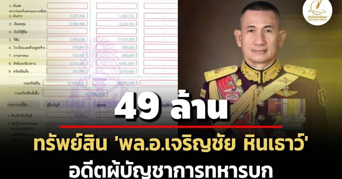 ป.ป.ช. เปิดทรัพย์สิน 'พล.อ.เจริญชัย หินเธาว์' อดีตผู้บัญชาการทหารบก ทรัพย์สิน 49 ล. สะสมปืน 8 กระบอก รายได้ 2.1 ล./ปี