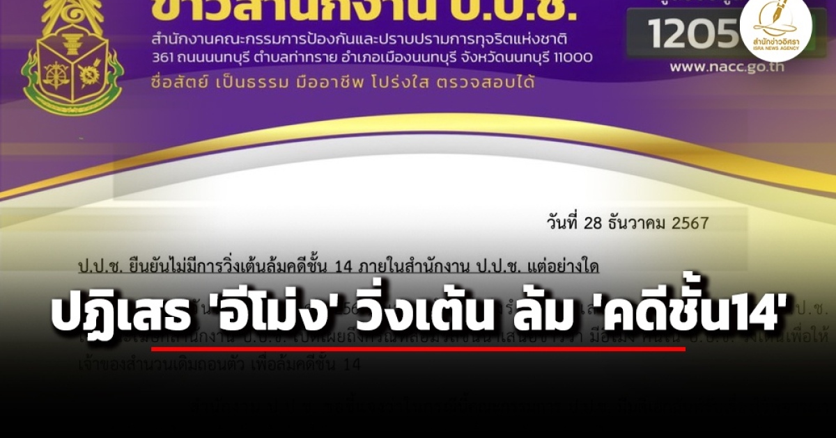 สำนักข่าวอิศรา (www.isranews.org) รายงานว่า วันที่ 28 ธันวาคม 2567 สำนักงานคณะกรรมการป้องกันและปราบปราบการทุจริตแห่งชาติ (ป.ป.ช.) ส่งเอกสารชี้แจง ยืนยัน ป.ป.ช.ไม่มีการวิ่งเต้นล้มคดีชั้น 14 ภายในสำนักงาน ป.ป.ช. แต่อย่างใด