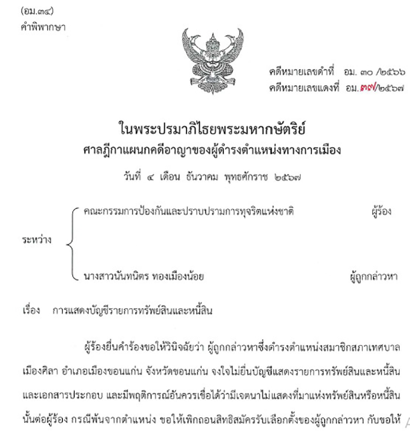 ศาลฎีกาแผนกคดีอาญาของผู้ดำรงตำแหน่งทางการเมือง วันที่ 4 เดือน ธันวาคม พุทธศักราช 2567 ระหว่าง คณะกรรมการป้องกันและปราบปรามการทุจริตแห่งชาติ ผู้ร้อง นางสาวนันทนิตร ทองเมืองน้อย ผู้ถูกกล่าวหา เรื่อง การแสดงบัญชีรายการทรัพย์สินและหนี้สิน