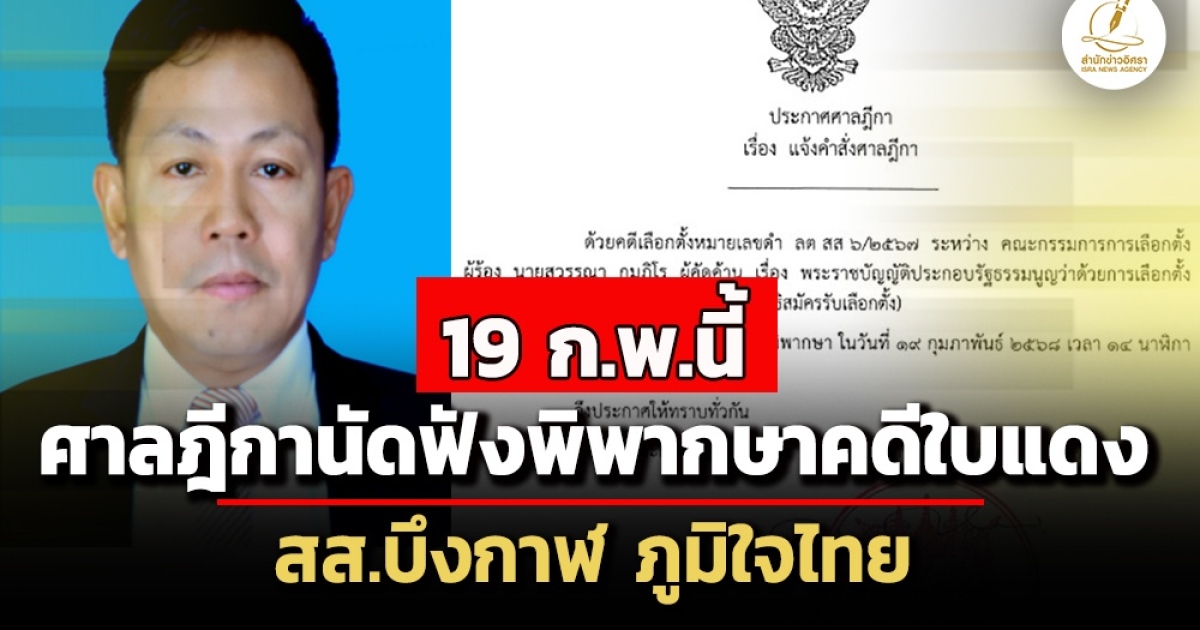 ศาลฎีกาออกประกาศ นัดฟังคำพิพากษาคดีเพิกถอนสิทธิ์สมัครรับเลือกตั้ง ‘สุวรรณา กุมภิโร’ สส.บึงกาฬพรรคภูมิใจไทย 19 ก.พ. นี้ หลัง กกต.ยื่นคำร้อง กรณีสนันสนุนให้ทรัพย์สินวัด หาเสียงรื่นเริง