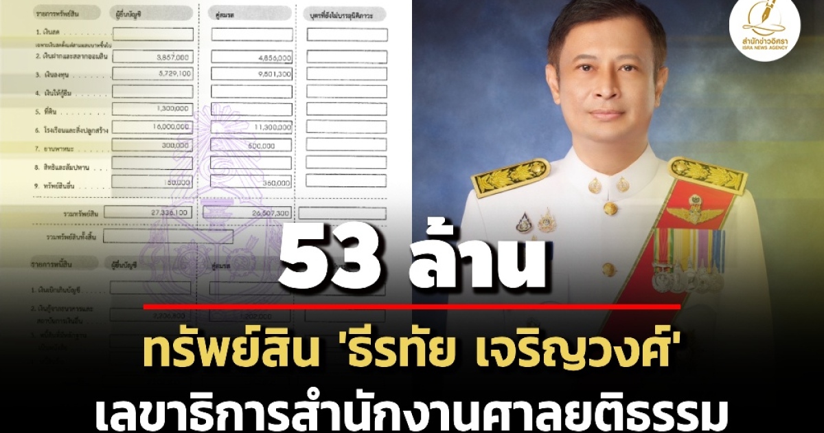 สำนักข่าวอิศรา (www.isranews.org) รายงานว่า เมื่อเร็ว ๆ นี้ สำนักงานคณะกรรมการการป้องกันและปราบการทุจริตแห่งชาติ (ป.ป.ช.) เปิดเผยบัญชีแสดงรายการทรัพย์สินและหนี้สินผู้ดำรงตำแหน่งระดับสูง ราย นายธีรทัย เจริญวงศ์ เลขาธิการสำนักงานศาลยุติธรรม กรณีเข้ารับตำแหน่ง เมื่อวันที่ 1 ต.ค. 2567