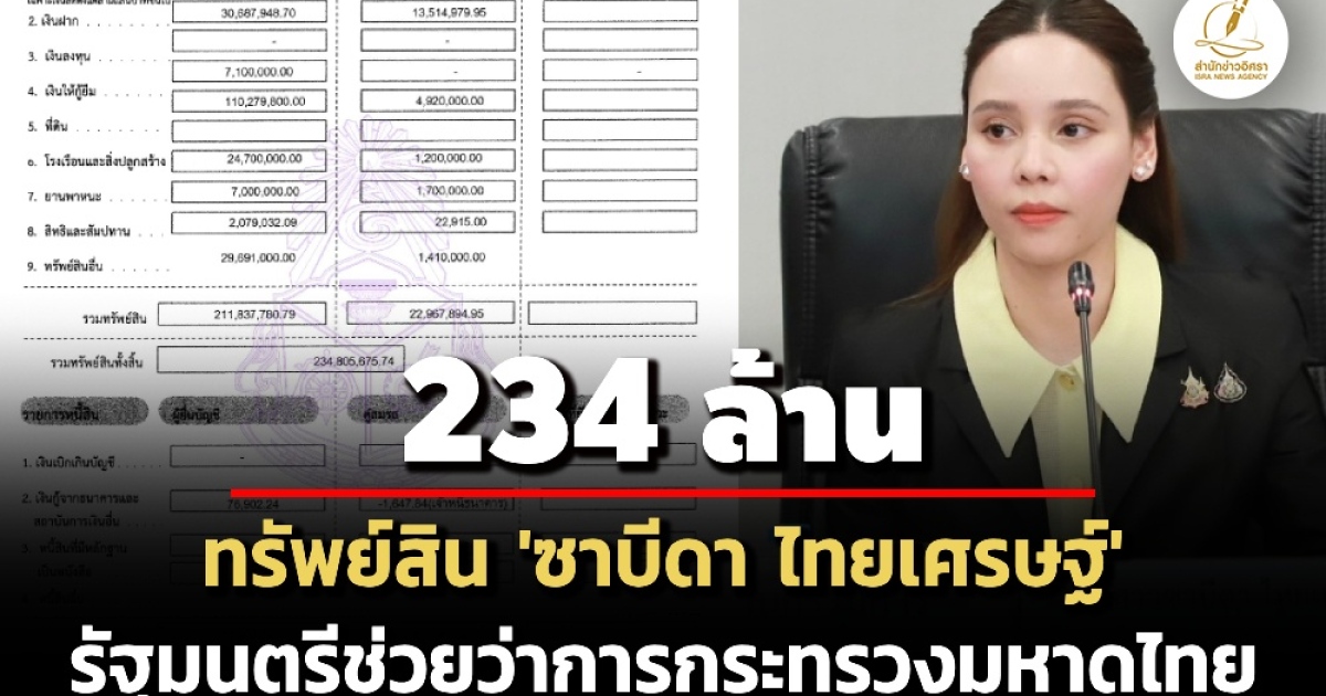 ป.ป.ช. เปิดทรัพย์สิน 'ซาบีดา ไทยเศรษฐ์' รัฐมนตรีช่วยว่าการกระทรวงมหาดไทย ทรัพย์สิน 234 ล. ที่ดิน 64 แปลง รวม110 ล. รายได้ 3.4 ล./ปี