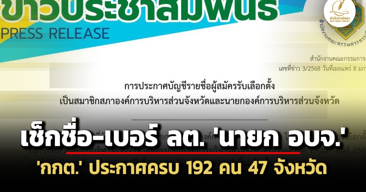 สำนักงานคณะกรรมการการเลือกตั้ง ประกาศรายชื่อ สมาชิกสภาองค์การบริหารส่วนจังหวัด 6,815 คน - นายกองค์การบริหารส่วนจังหวัด 192 คน เช็กชื่อ-เบอร์ ครบ 47 จังหวัด