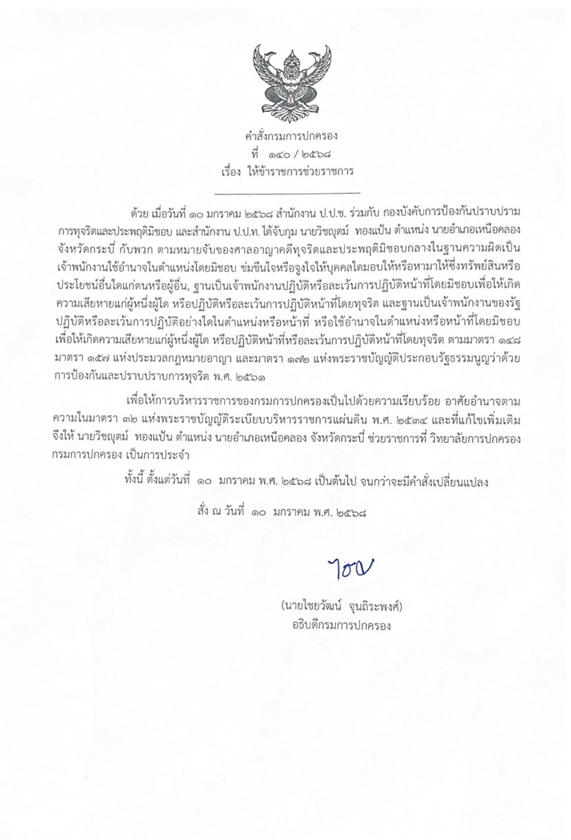 อธิบดีกรมการปกครอง-ผู้ว่าราชการจังหวัดกระบี่ ลงนามคำสั่งย้ายด่วน วิชญุตม์ ทองแป้น นายอำเภอเหนือคลอง จังหวัดกระบี่ - อุไรวรรณ ยงกิจวรกุล เจ้าหน้าที่ปกครองชำนาญงาน ที่ทำการปกครองอำเภอเหนือคลอง ภายหลัง ปปป.-ป.ป.ช.-ป.ป.ท. สนธิกำลังบุกจับกุม ทุจริตเรียกเงินบริษัทรับเหมาก่อสร้าง
