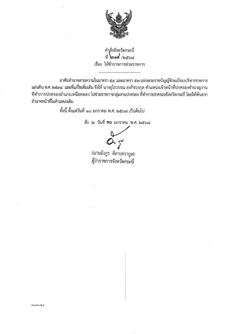 รายงานข่าวระบุว่า นอกจากนี้นายอังกูร ศีลาเทวากูล ผู้ว่าราชการจังหวัดกระบี่ ได้ลงนามในคำสั่งจังหวัดกระบี่ ที่ 218/2568 ให้นางอุไรวรรณ ยงกิจวรกุล เจ้าหน้าที่ปกครองชำนาญงาน ที่ทำการปกครองอำเภอเหนือคลอง ไปช่วยราชการกลุ่มงานปกครอง ที่ทำการปกครองจังหวัดกระบี่ โดยให้พ้นจากอำนาจหน้าที่ในตำแหน่งเดิม ตั้งแต่วันที่ 10 ม.ค. 68 เป็นต้นไป