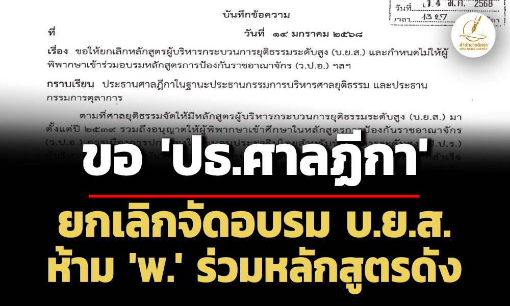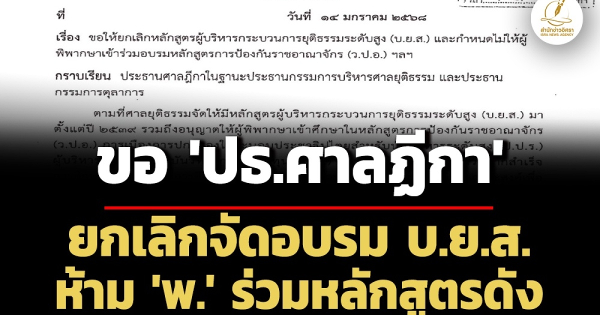 สำนักข่าวอิศรา (www.isranews.org) รายงานว่า เมื่อวันที่ 14 ม.ค.2568 นายบุญเขตร์ พุ่มทิพย์ อธิบดีผู้พิพากษาศาลภาษีอากรกลางช่วยทำงานชั่วคราวในตำแหน่งผู้พิพากษาศาลฎีกา กรรมการบริหารศาลยุติธรรม และ นายอนุรักษ์ สง่าอารีย์กูล ผู้พิพากษาศาลฎีกาและกรรมการตุลาการ ได้ทำบันทึกข้อความ ถึงประธานศาลฏีกาในฐานะประธานกรรมการบริหารศาลยุติธรรม และประธานกรรมการตุลาการ เพื่อขอให้ยกเลิกหลักสูตรผู้บริหารกระบวนการยุติธรรมระดับสูง (บ.ย.ส.) และกำหนดไม่ให้ผู้พิพากษาเข้าร่วมอบรมหลักสูตรการป้องกันราชอาณาจักร (ว.ป.อ.) หลักสูตรการเมืองการปกครองในระบอบประชาธิบไตยสำหรับนักบริหาระดับดับสูง (ป.ป.ร.) หลักสูตรผู้บริหารระดับสูงสถาบันวิทยาการตลาดทุน (วตท.) หรือหลักสูตรอื่นในลักษณะเดียวกัน