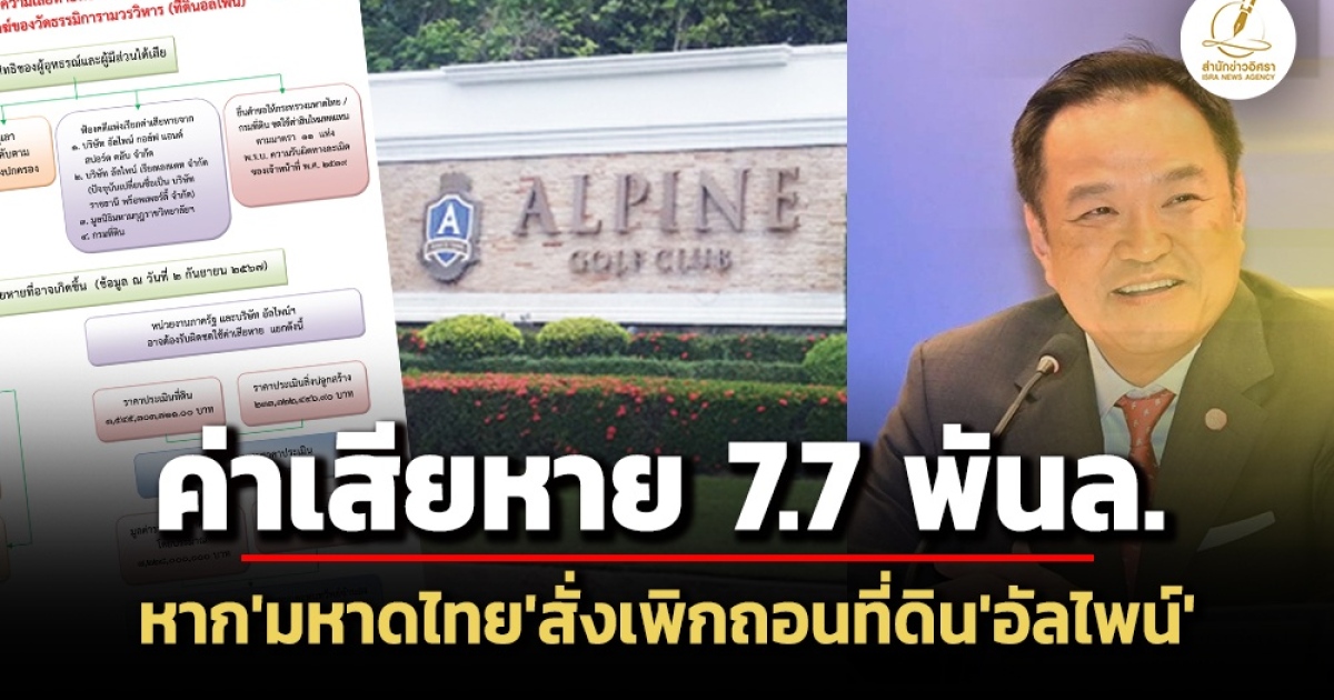 ‘อนุทิน’ รับ ‘กรมที่ดิน’ ส่อโดนฟ้องเรียกค่าเสียหาย หากมีการเพิกถอนการโอนที่ดิน ‘อัลไพน์’ เผย ‘กรมที่ดิน-มูลนิธิมหามกุฏราชวิทยาลัยฯ-บ.ครอบครัวชินวัตร’ อาจต้องรับผิดชอบค่าเสียหายสูงถึง 7.7 พันล้าน หากมีการเพิกถอนการโอนที่ดินอัลไพน์